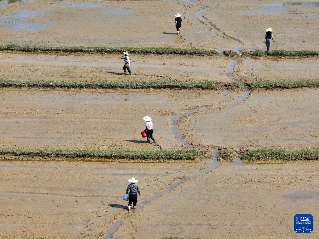 4月19日,在湖南省娄底市双峰县井字镇蒋市村,农民拎着秧苗前往大田准备抛秧(无人机照片)。