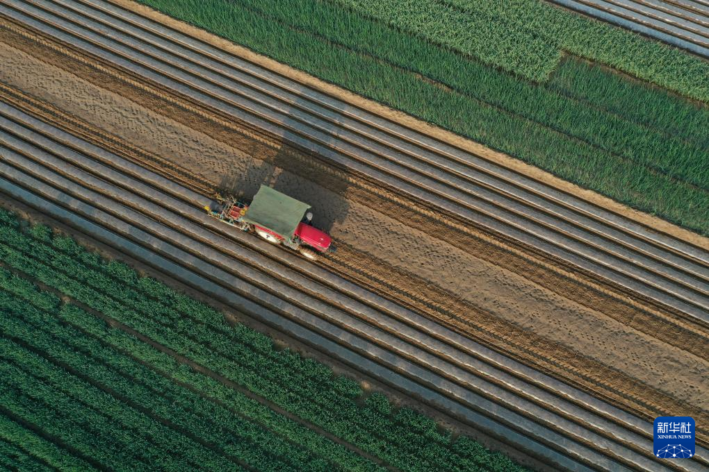4月19日,在河北省唐山市丰润区银城铺镇大八里村,农民驾驶农机翻耕土地(无人机照片)。