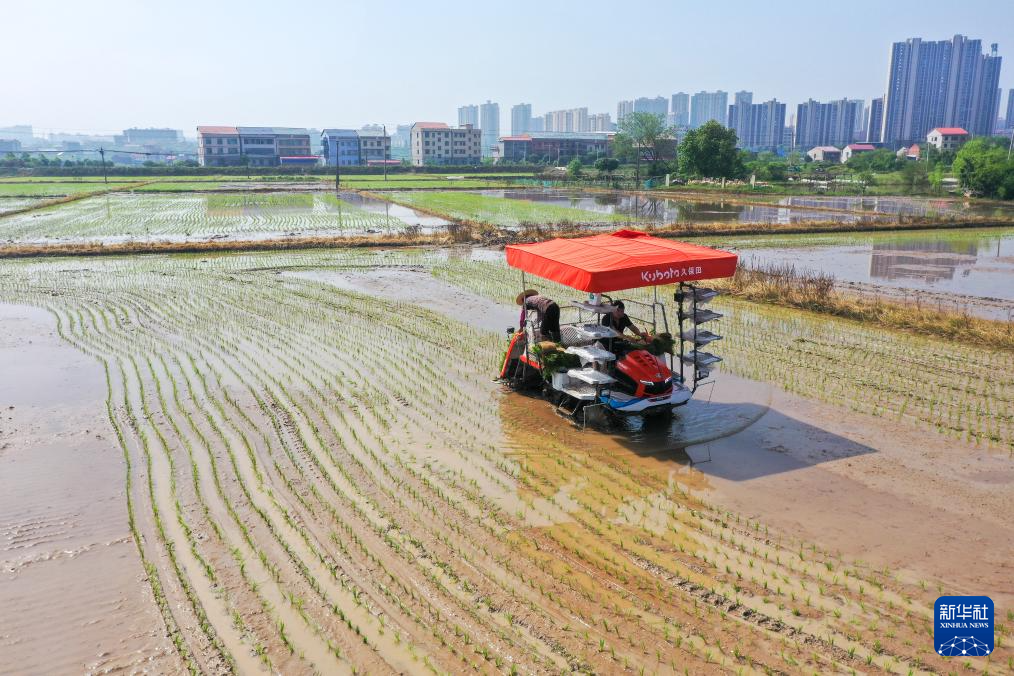 4月19日,在湖南省衡阳市衡阳县西渡镇梅花村,农民驾驶插秧机在进行水稻插秧作业(无人机照片)。