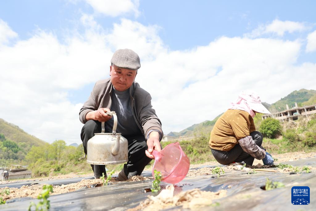 4月18日,在甘肃省陇南市康县豆坝镇豆坝村,农民栽种中药材贯叶连翘。