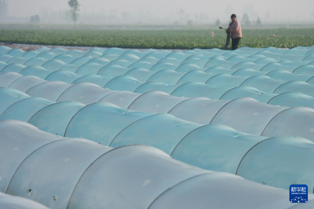 4月18日,河南省安阳市内黄县马上乡农民在管理小拱棚豆角。