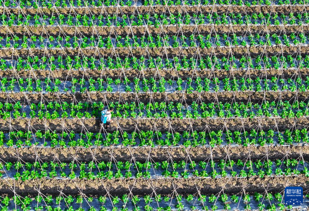 4月19日,湖南省常宁市宜阳街道万寿村农民在管护蔬菜(无人机照片)。