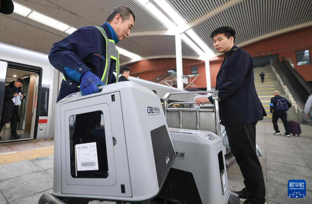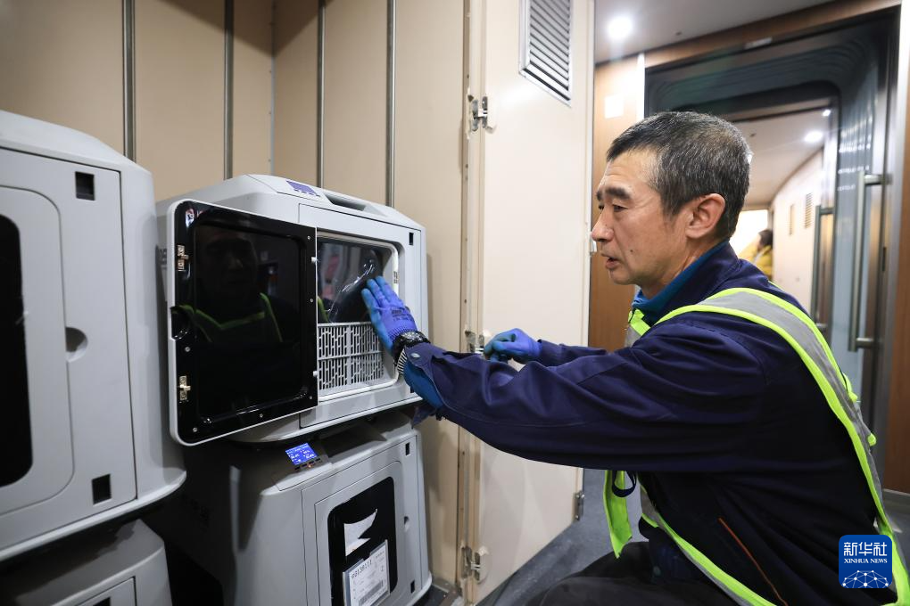 4月19日,中铁快运哈尔滨西站营业部工作人员在G118次列车的车厢内检查“智能座舱”运输箱。