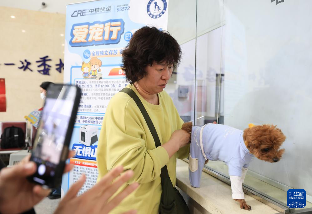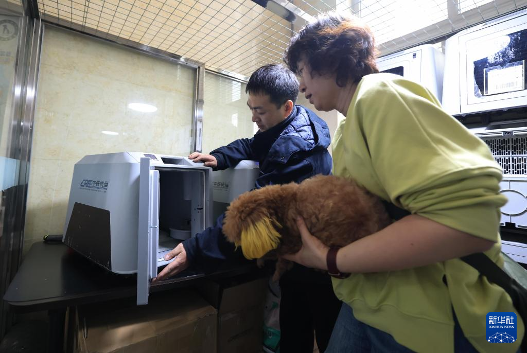4月19日,旅客在中铁快运哈尔滨西站营业部为即将进入“智能座舱”运输箱的宠物狗穿衣服。