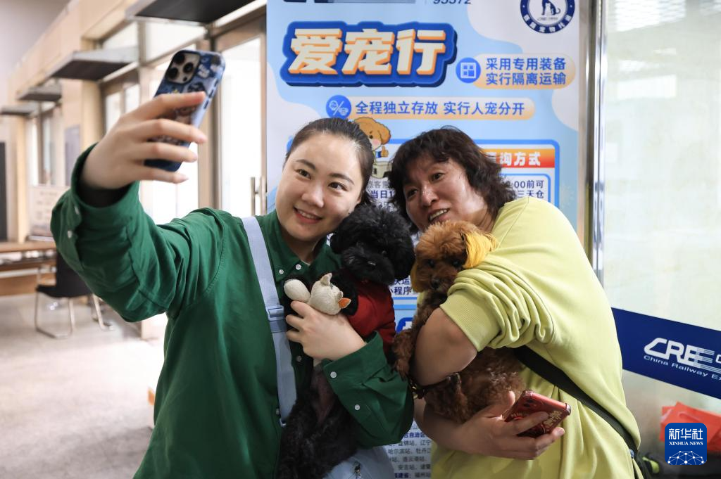 4月19日,旅客在中铁快运哈尔滨西站营业部与即将进入“智能座舱”运输箱内的宠物狗合影。