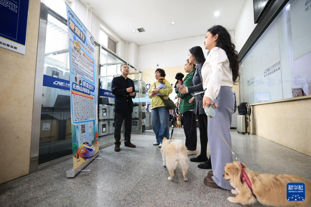 4月19日,中铁快运哈尔滨西站营业部工作人员(左一)为旅客讲解“爱宠行”高铁宠物托运服务注意事项。