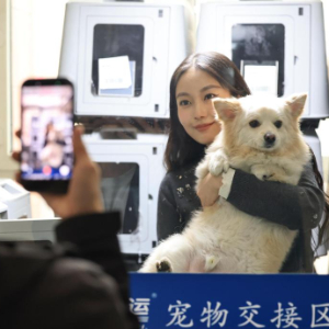 4月19日,旅客在中铁快运哈尔滨西站营业部与即将进入“智能座舱”运输箱内的宠物狗互动。