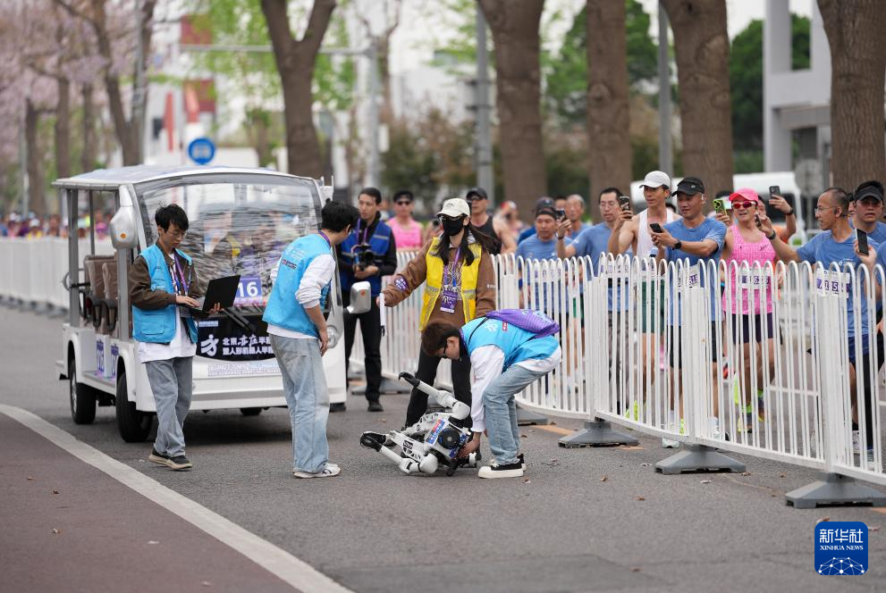 4月19日,天啸队自主人形机器人选手天工Ultra-2026(前右二)在比赛中摔倒。