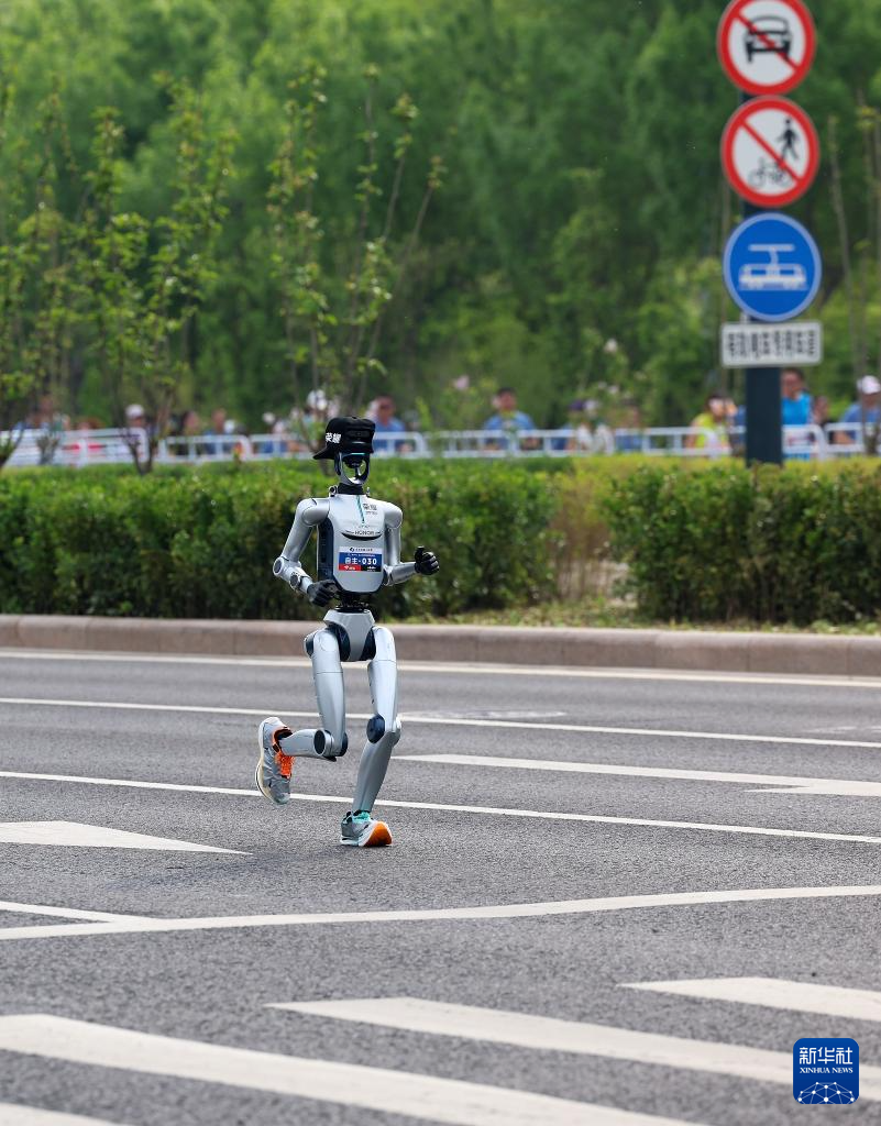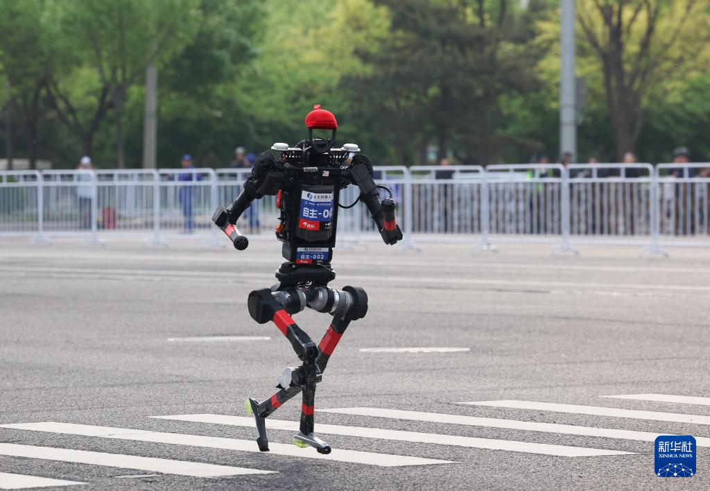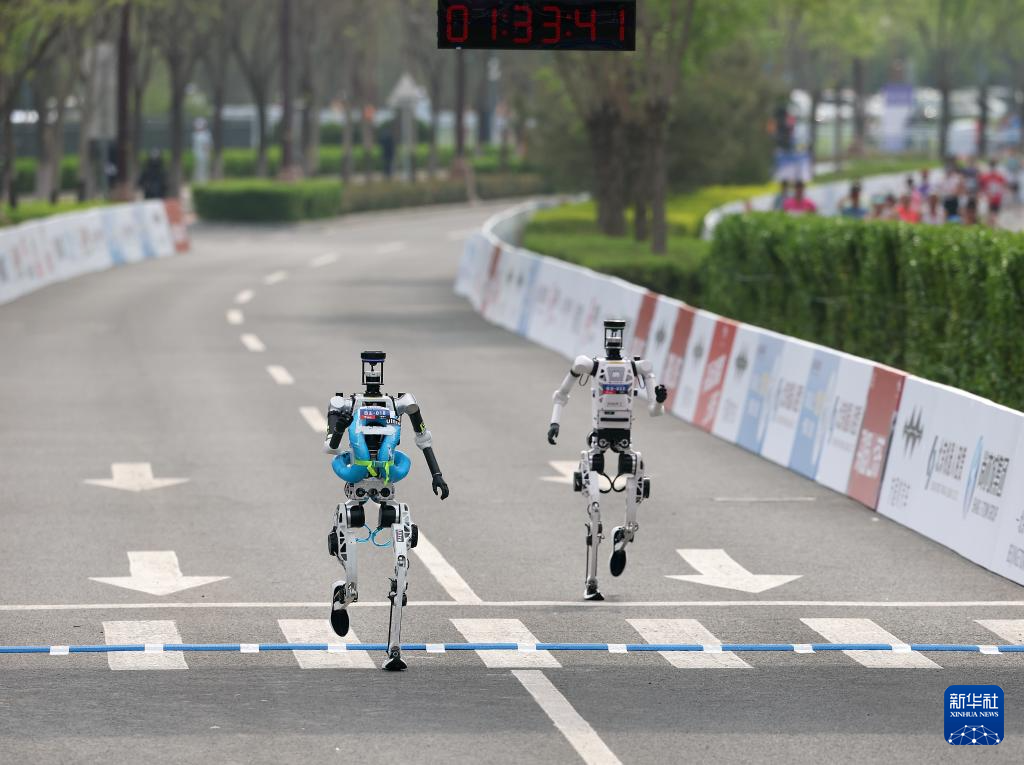 4月19日,天翼队自主人形机器人选手天工Ultra-2025(左前)在比赛中。