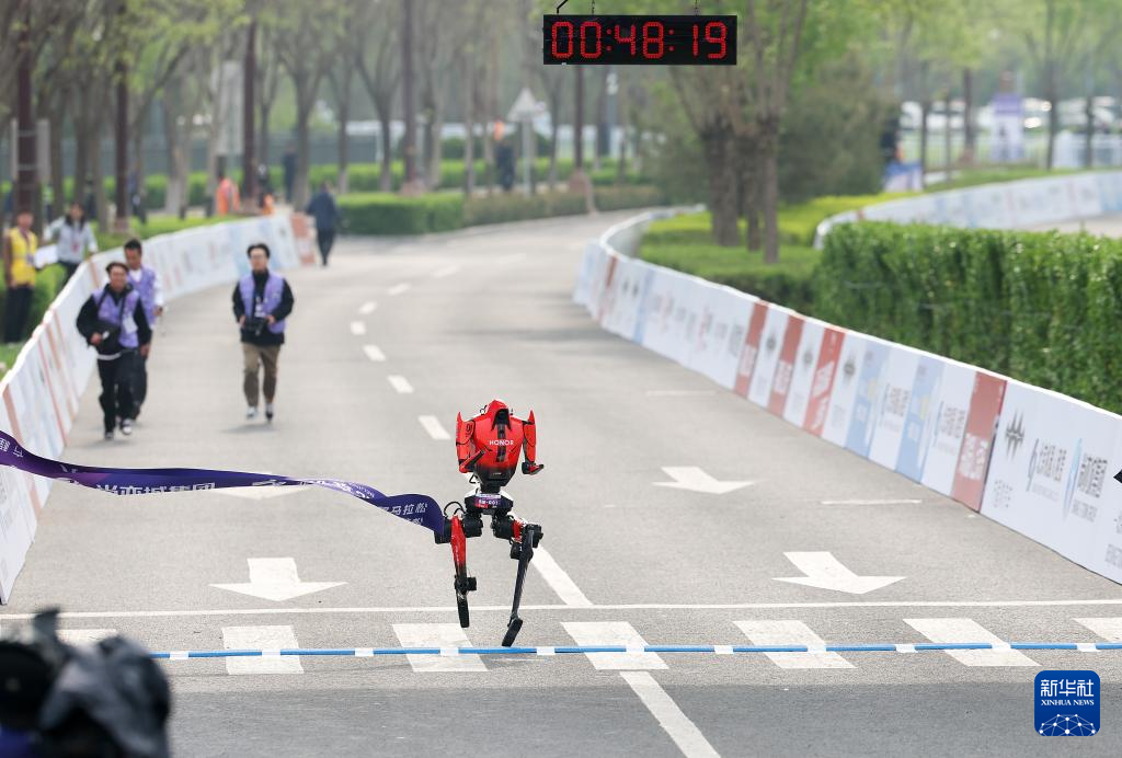 4月19日,雷霆闪电队自主人形机器人选手闪电在比赛中冲线。