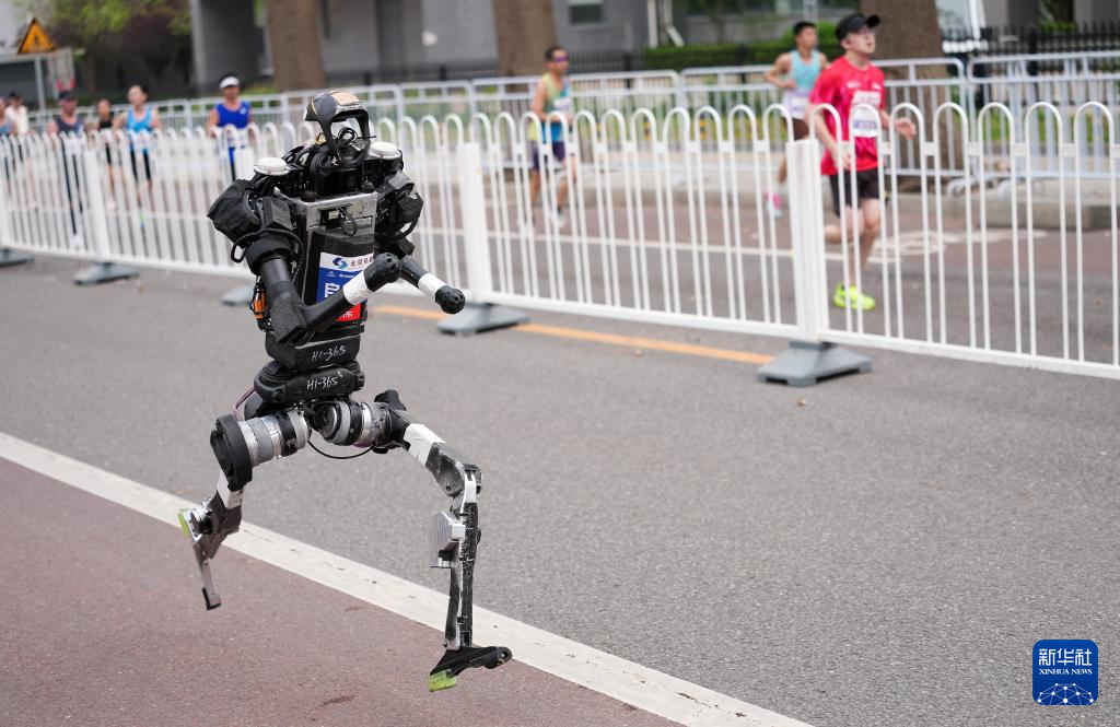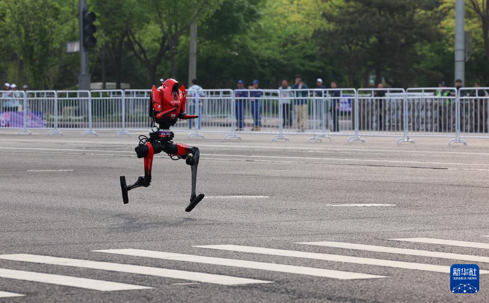 4月19日,北Y赛队自主人形机器人选手宇树H1(前)在比赛中。