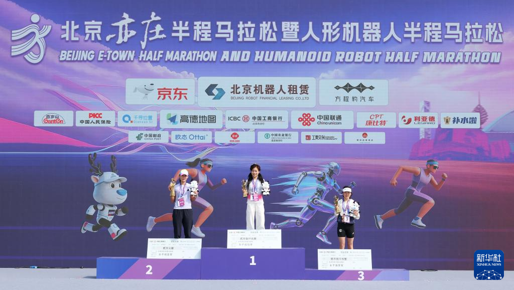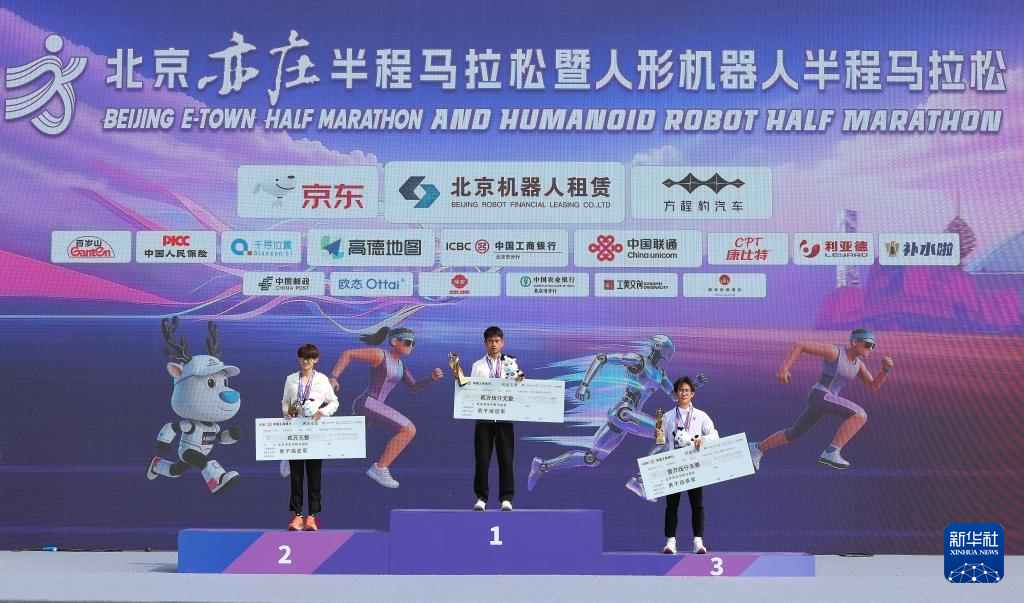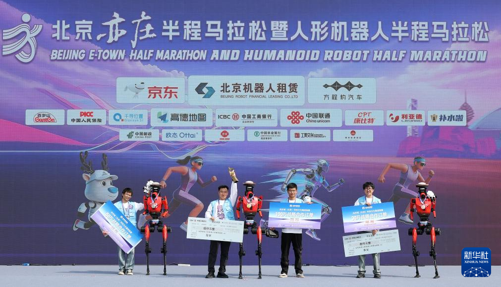 4月19日,人形机器人半程马拉松冠军齐天大圣队自主选手闪电(中)、亚军雷霆闪电队自主选手闪电(左二)和季军星火燎原队自主选手闪电(右一)在颁奖仪式上。