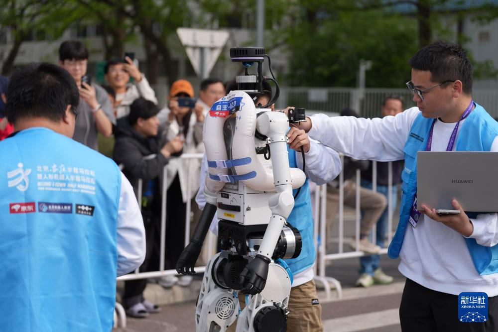 4月19日,天通队自主人形机器人选手天工Ultra-2026(右)在补给点换电池后重新出发。