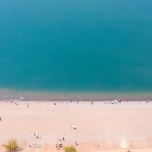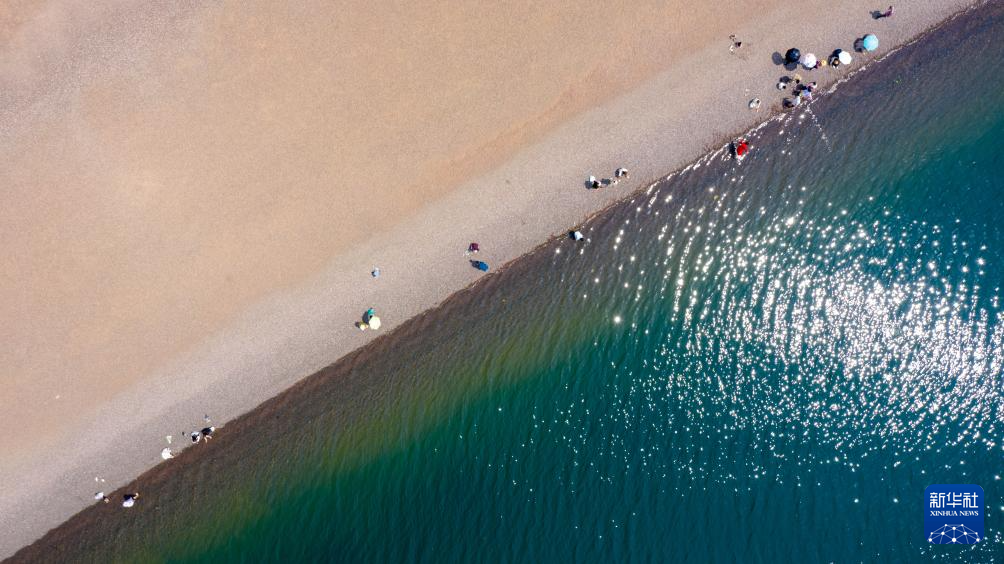 4月18日,游客在抚仙湖畔游玩(无人机照片)。