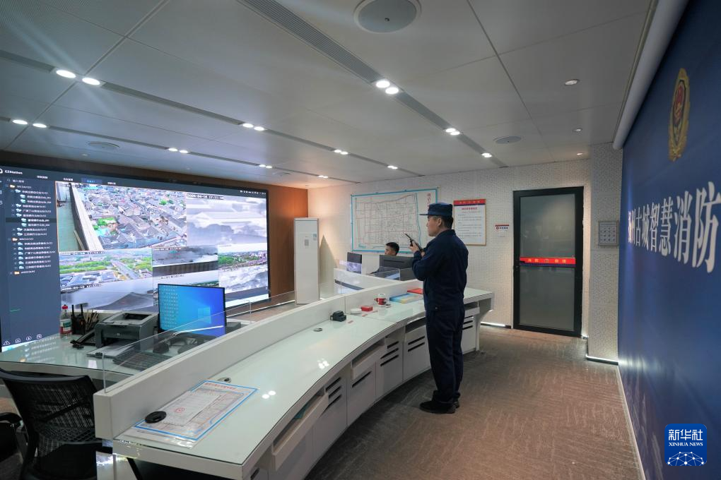 在扬州市广陵区东关街政府专职消防队指挥中心,“协同治理合伙人”张华峰依托“古城智慧消防监管系统”开展古城街区消防实况监测和现场指挥(4月16日摄)。