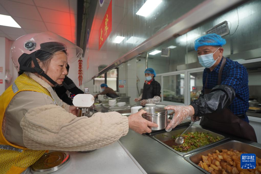 在扬州市广陵区汶河街道社区食堂内,身为“幸福食堂合伙人”的工作人员(右)为居民打饭(4月17日摄)。