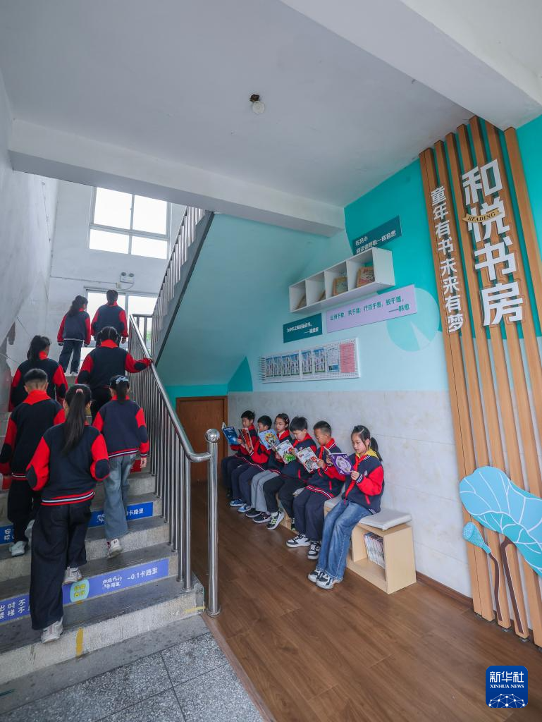4月22日,小学生在长兴县吕山乡中心小学的和悦书房读书角阅读。