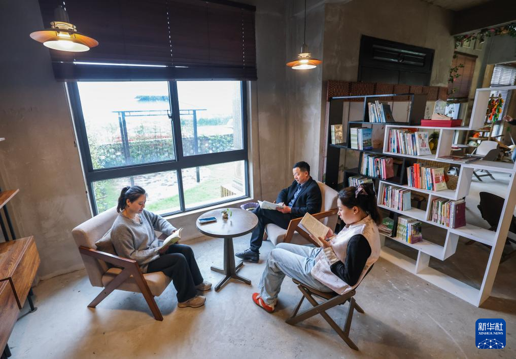 4月22日,村民在长兴县吕山乡吕虹村“荷遇”咖啡馆特色阅读空间阅读。