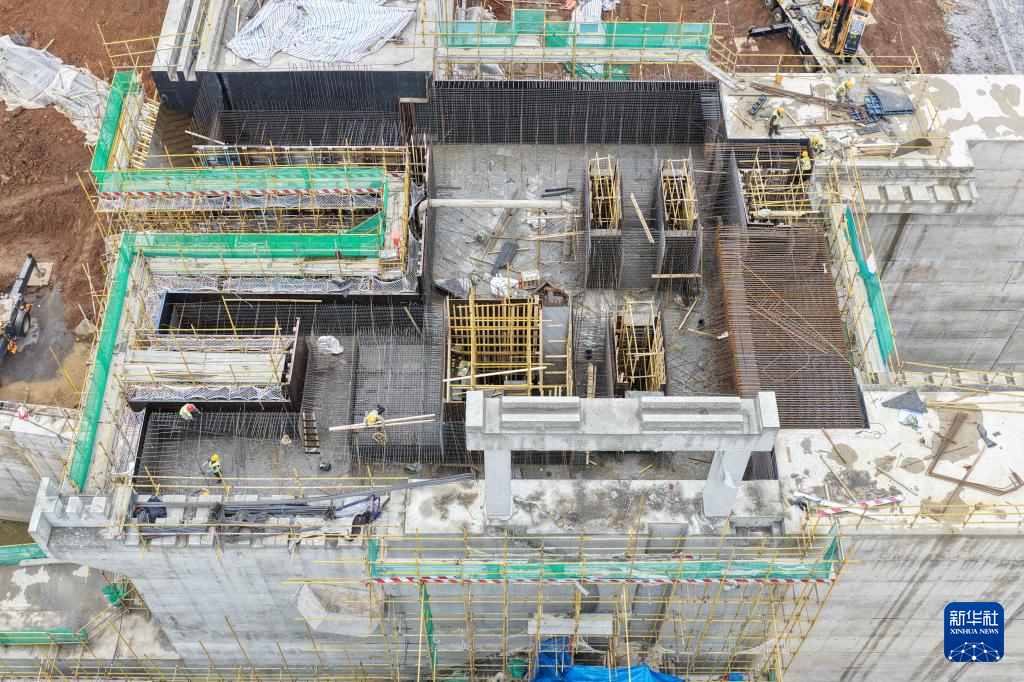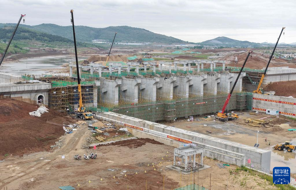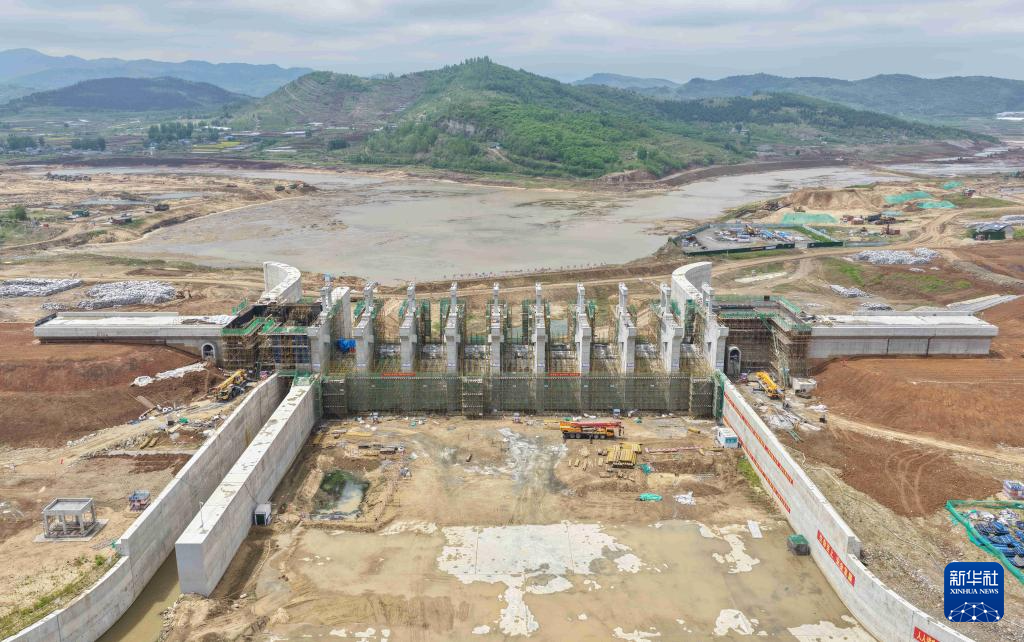 这是4月22日拍摄的蒙河双堠水库重力坝施工现场(无人机照片)。