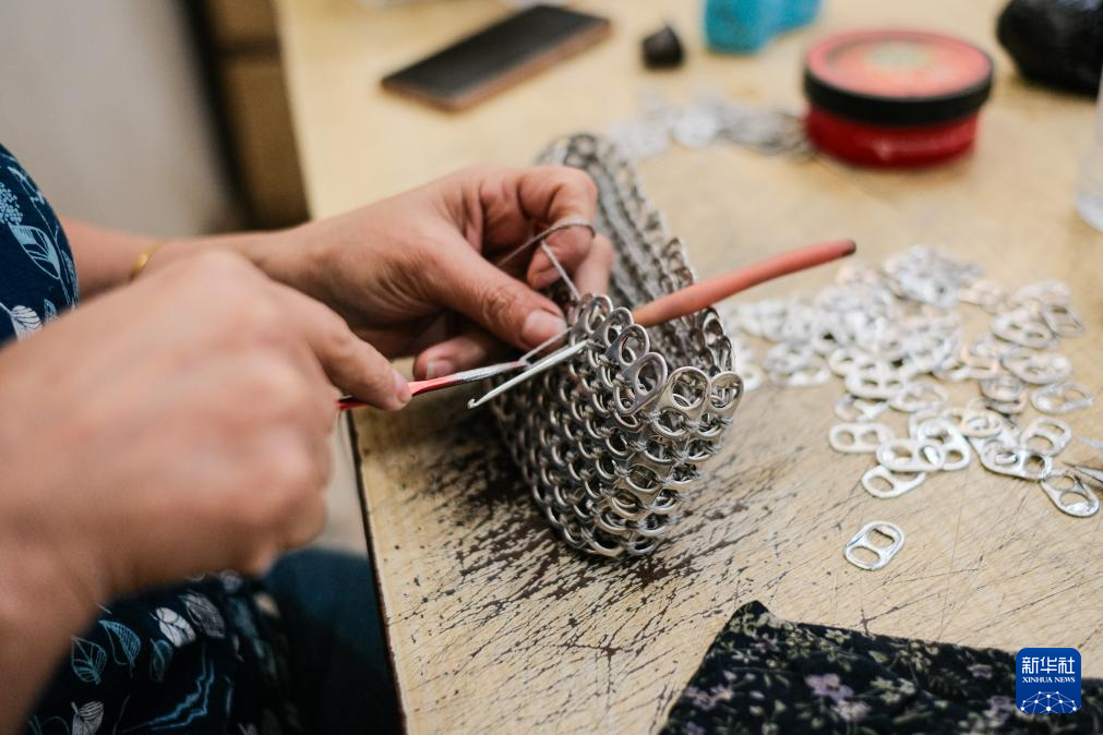 4月21日,在位于埃及开罗“垃圾城”的手工作坊内,工作人员用易拉罐拉环制作环扣包。