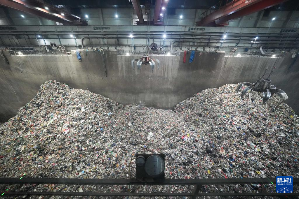 4月22日,在军信股份黑麋峰环保园区,工作人员操作抓斗将垃圾运至焚烧炉内。