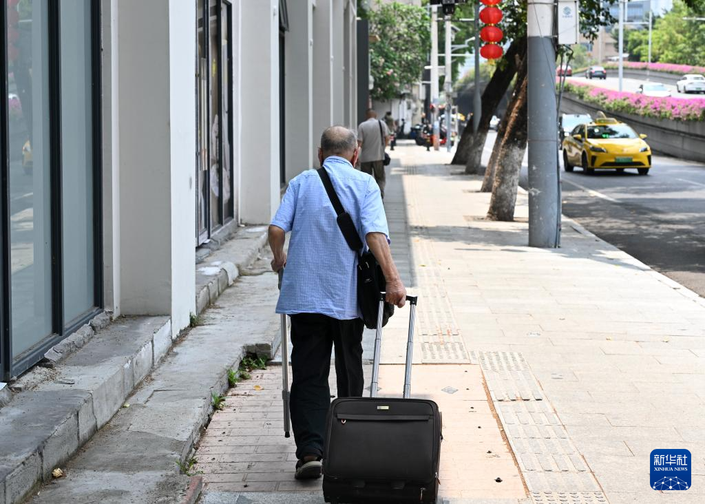 4月19日,在广州越秀区,林宝山拉着行李箱走在去摆摊的路上。