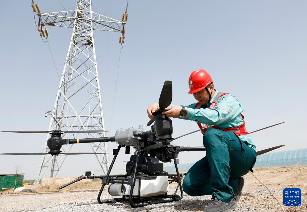 4月23日,国网银川供电公司输电运检中心员工准备操作重载多旋翼无人机对110千伏沙永线70号杆塔瓷质绝缘子串开展冲洗作业。