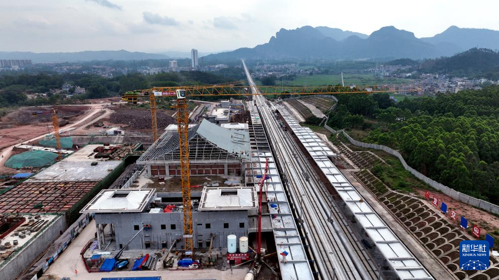 这是建设进入尾声的岑溪东站(3月27日摄,无人机照片)。