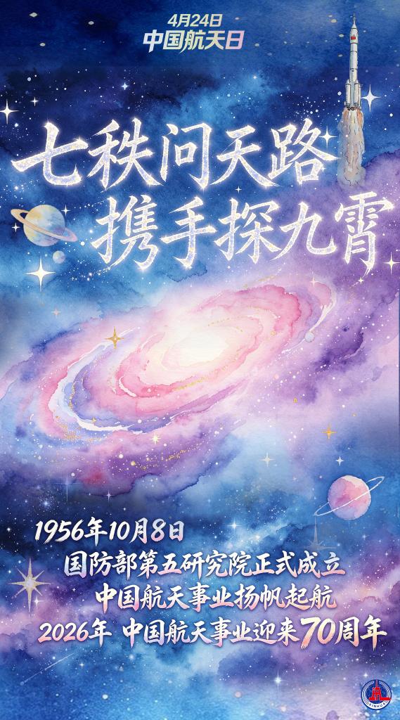 2026年4月24日是第十一个“中国航天日”,主题为“七秩问天路 携手探九霄”。1956年10月8日,国防部第五研究院正式成立,中国航天事业扬帆起航。2026年,中国航天事业迎来70周年。(部分海报素材由AI辅助生成)