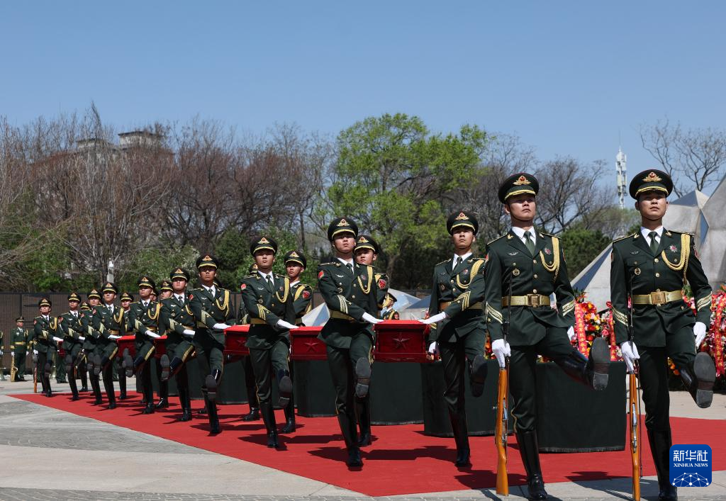 4月23日,在沈阳抗美援朝烈士陵园,礼兵护送志愿军烈士棺椁缓步进入纪念广场。