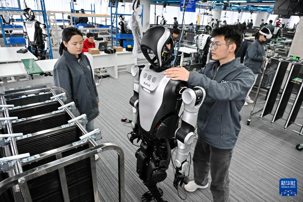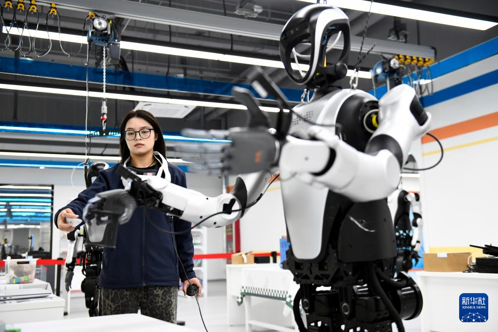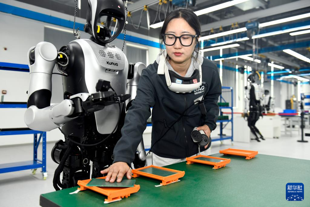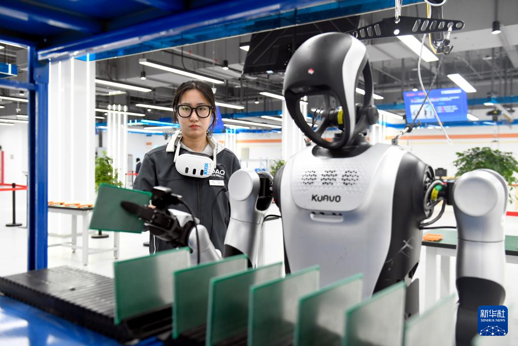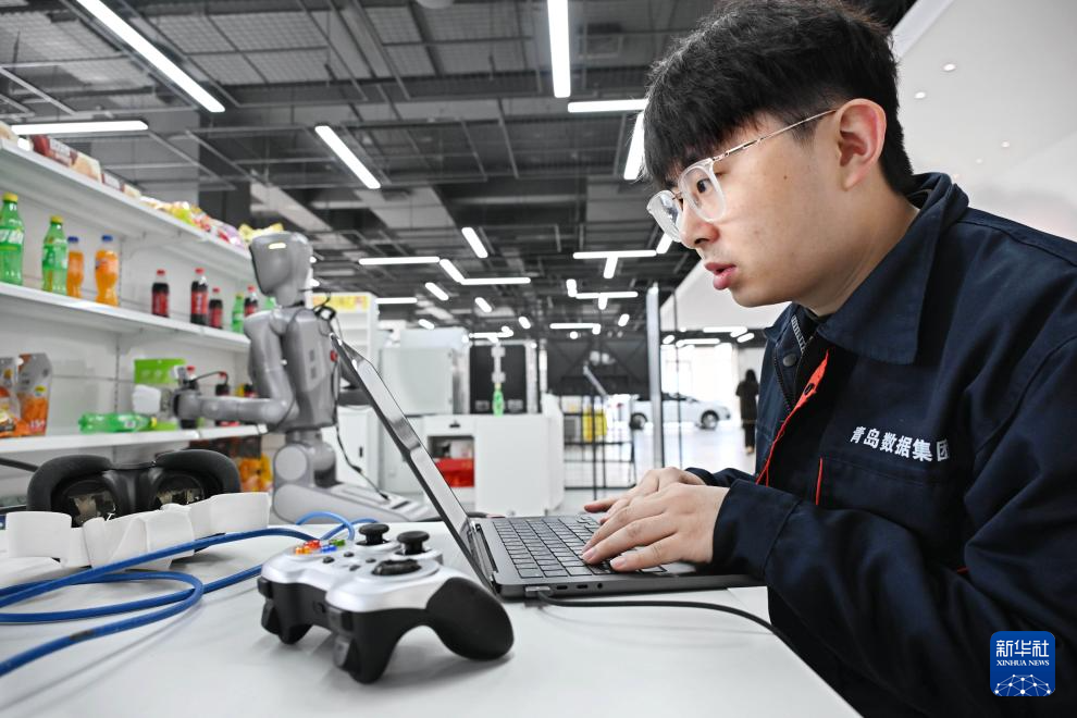 4月22日,在青岛市具身智能机器人公共训练场,训练师马婕在仓储场景内指导机器人训练。