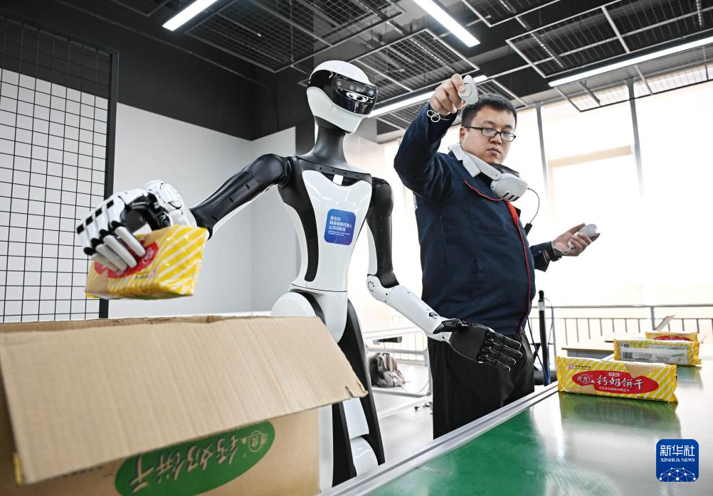 3月23日,在青岛市人形机器人数据采集训练场,训练师在快递物流场景内指导机器人进行训练。