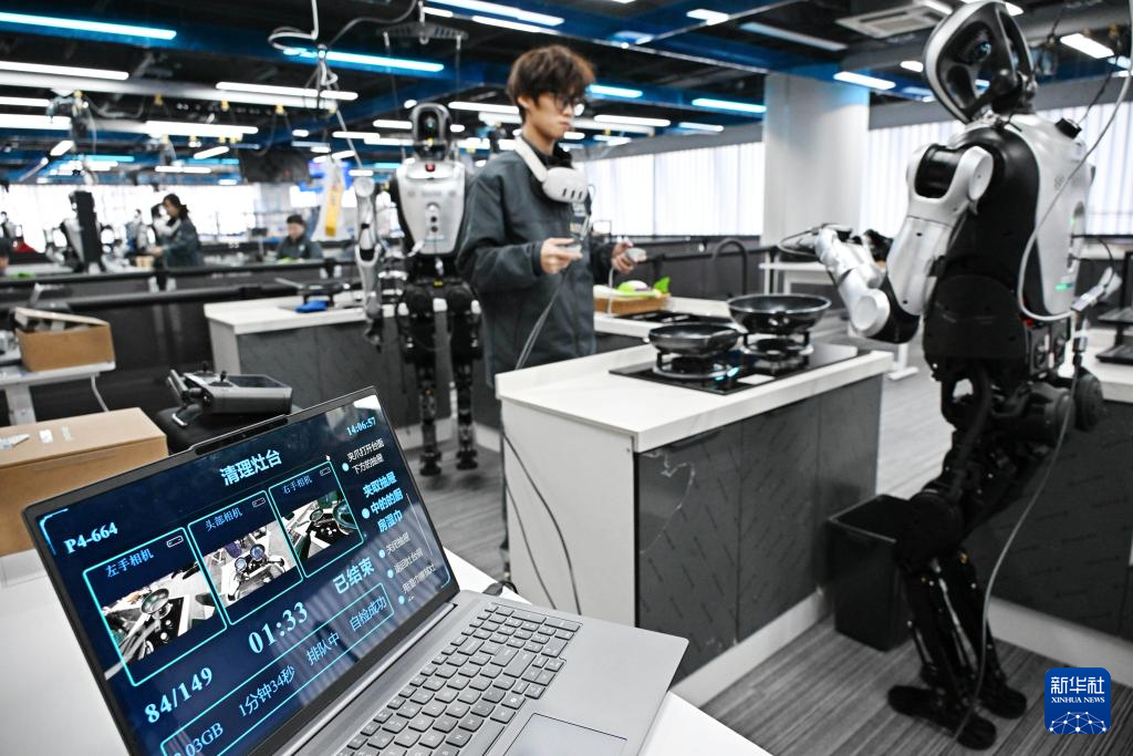 4月21日,在济南市平阴县智创空间孵化园人形机器人数据训练中心,具身智能训练师赵一琳在“生活服务场景——台面清洁”训练机器人。