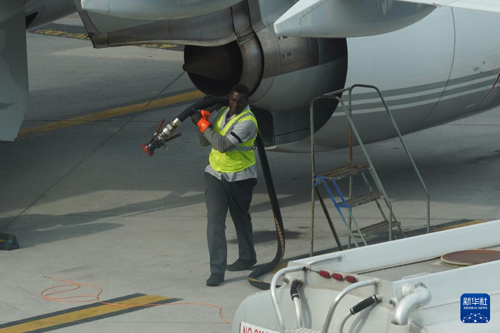4月23日,在美国纽约拉瓜迪亚机场,工作人员为一架飞机加油。