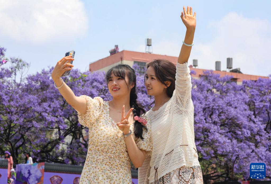 云南省昆明市五华区教场中路两旁蓝花楹盛开,吸引了不少市民游客前来拍照打卡(4月25日摄)。