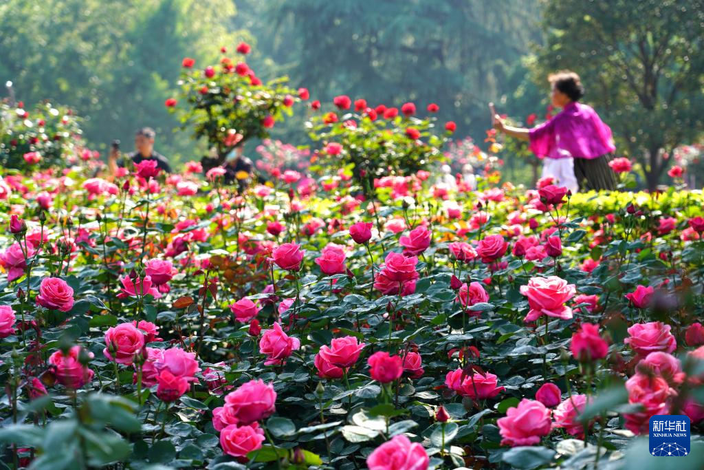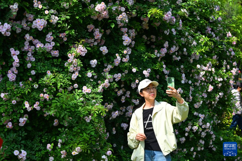 4月25日,游人在河南省开封市滨河路环城公园内盛开的蔷薇花旁留影。