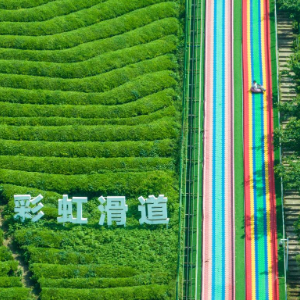 4月26日,游客在杭州市余杭区径山镇小古城村体验“彩虹滑道”(无人机照片)。