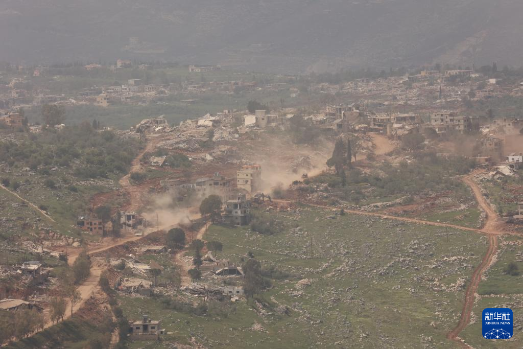 这是4月26日从以色列北部与黎巴嫩边境地带拍摄的黎巴嫩南部在战争中损毁的建筑。