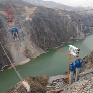洮河特大桥横跨位于青藏高原与黄土高原过渡带的洮河峡谷,是兰永临高速公路的咽喉控制性工程。大桥全长562.16米,主桥采用净跨400米上承式钢管混凝土拱桥设计,总用钢量1.5万吨,桥面距河面约170米,施工技术难度较大。项目计划2026年主拱合龙,2027年全线通车。