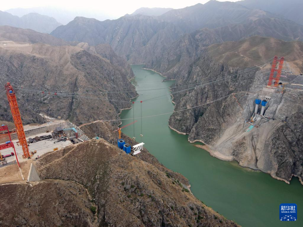 4月28日,兰永临高速公路洮河特大桥214吨钢管拱肋,在500吨级缆索吊装系统加持下,被平稳起吊至洮河上空(无人机照片)。