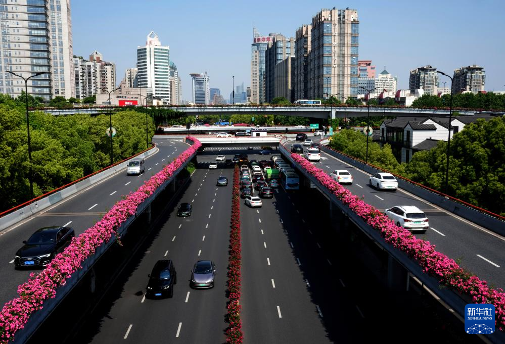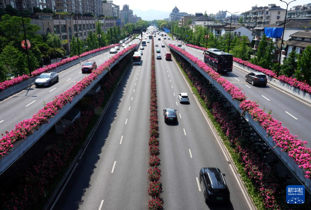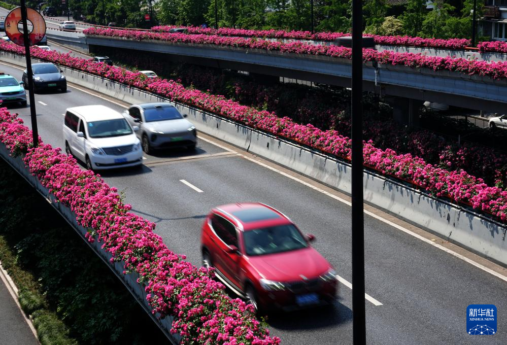 近日,杭州高架道路两侧种植的月季花盛放,呈现“空中花廊”景观。