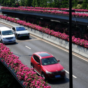4月30日,车辆驶过杭州中河高架路旁盛放的月季花。