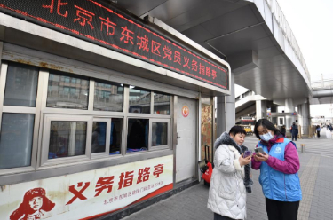 2月6日,北京市东城区建国门街道站东社区党员义务指路队的老队员带领十余名小学生志愿者在北京火车站广场开展春运志愿服务活动,为出行旅客提供换乘、乘车、购票指导等服务。
