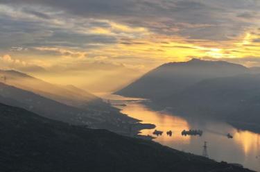 夕阳西下,在云南省昭通市镇雄县银厂村,霞光洒落在乌蒙群山间,航拍视角下,峰峦连绵,山河壮阔,宛如一幅气势恢宏的水墨画卷。