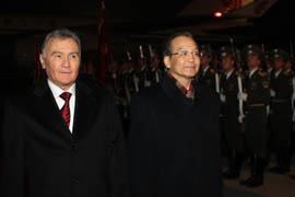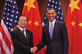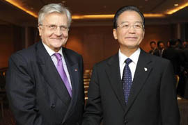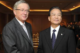 温家宝与欧元集团主席、卢森堡首相容克合影手