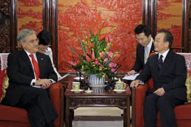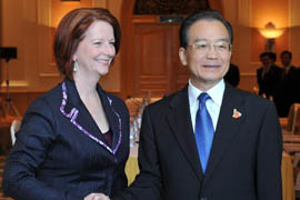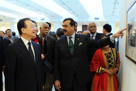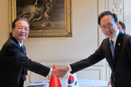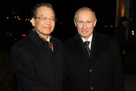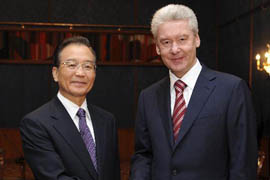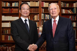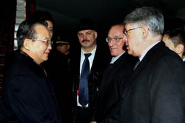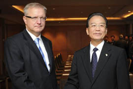 温家宝与欧盟委员会负责经济和货币事务的委员雷恩合影