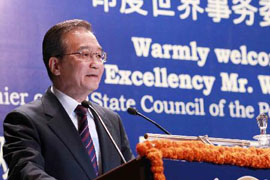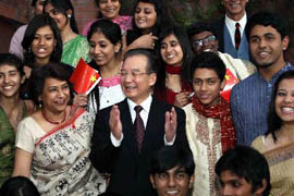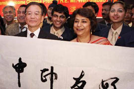 温家宝总理将亲笔书写的“中印友好”条幅赠送给泰戈尔国际学校师生