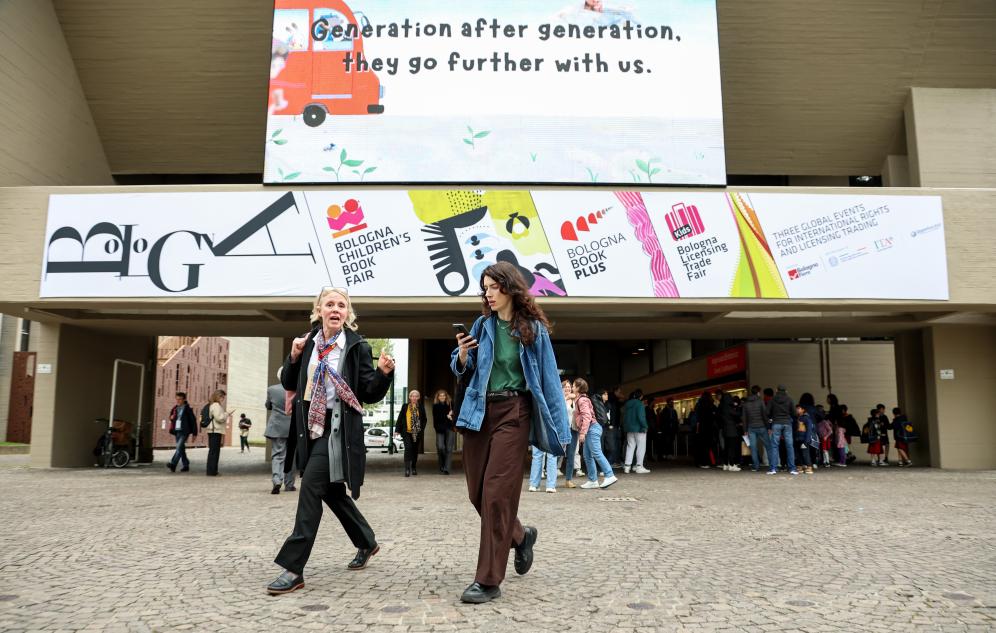 4月13日,在意大利博洛尼亚举行的博洛尼亚国际童书展上,观众从展会主题海报前走过。