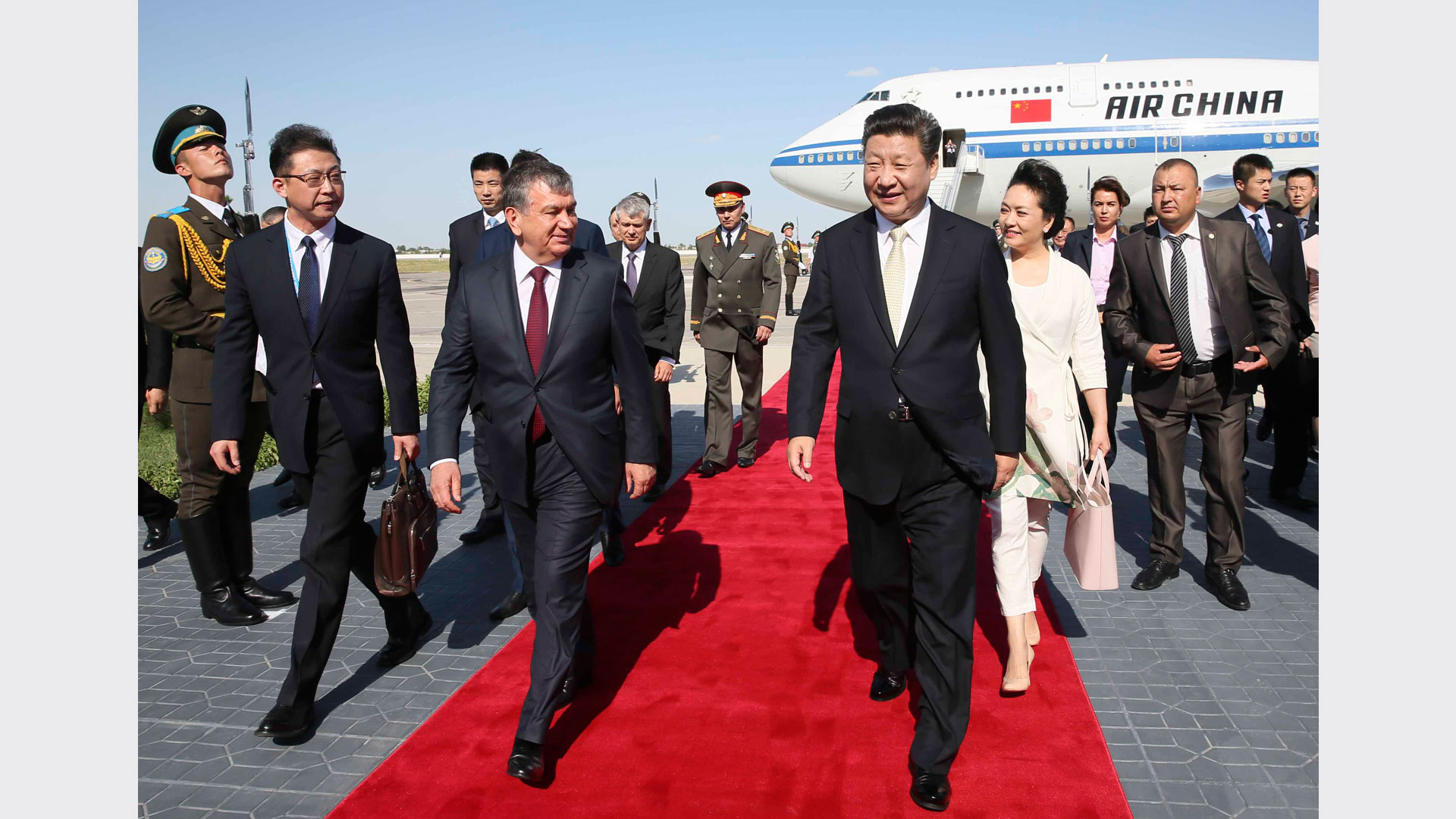 6月21日,国家主席习近平抵达布哈拉,开始对乌兹别克斯坦共和国进行国事访问并出席在塔什干举行的上海合作组织成员国元首理事会第十六次会议。这是在布哈拉国际机场,习近平和夫人彭丽媛受到乌兹别克斯坦总理米尔济约耶夫和布哈拉州州长埃萨诺夫等热情迎接。新华社记者兰红光摄