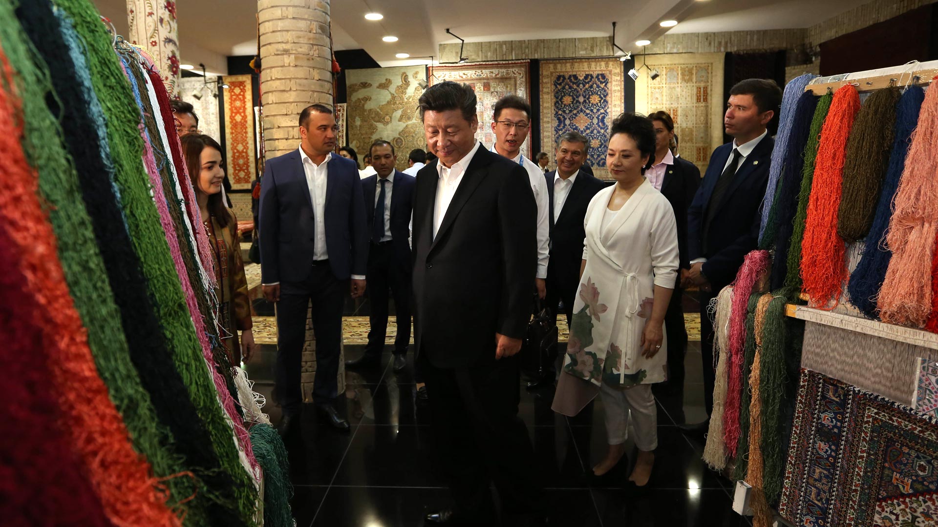 当地时间6月21日下午,正在对乌兹别克斯坦进行国事访问的国家主席习近平在乌兹别克斯坦总理米尔济约耶夫陪同下,来到布哈拉古城参观这座被称为“丝绸之路活化石”的历史文化名城。这是习近平和夫人彭丽媛参观一家地毯和丝绸作坊。新华社记者兰红光摄